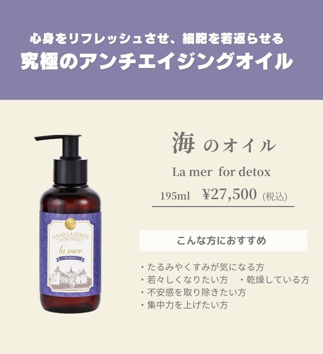 南フランスにある古城LASERREにてオーガニック製品を提供するシリウス社とHAABが共同開発したこだわりのオイル。原料の土壌からオーガニックにこだわり、厳選された自然由来の原料を贅沢に使用。保湿・浸透力に優れ、年齢に応じた肌悩みをサポート。